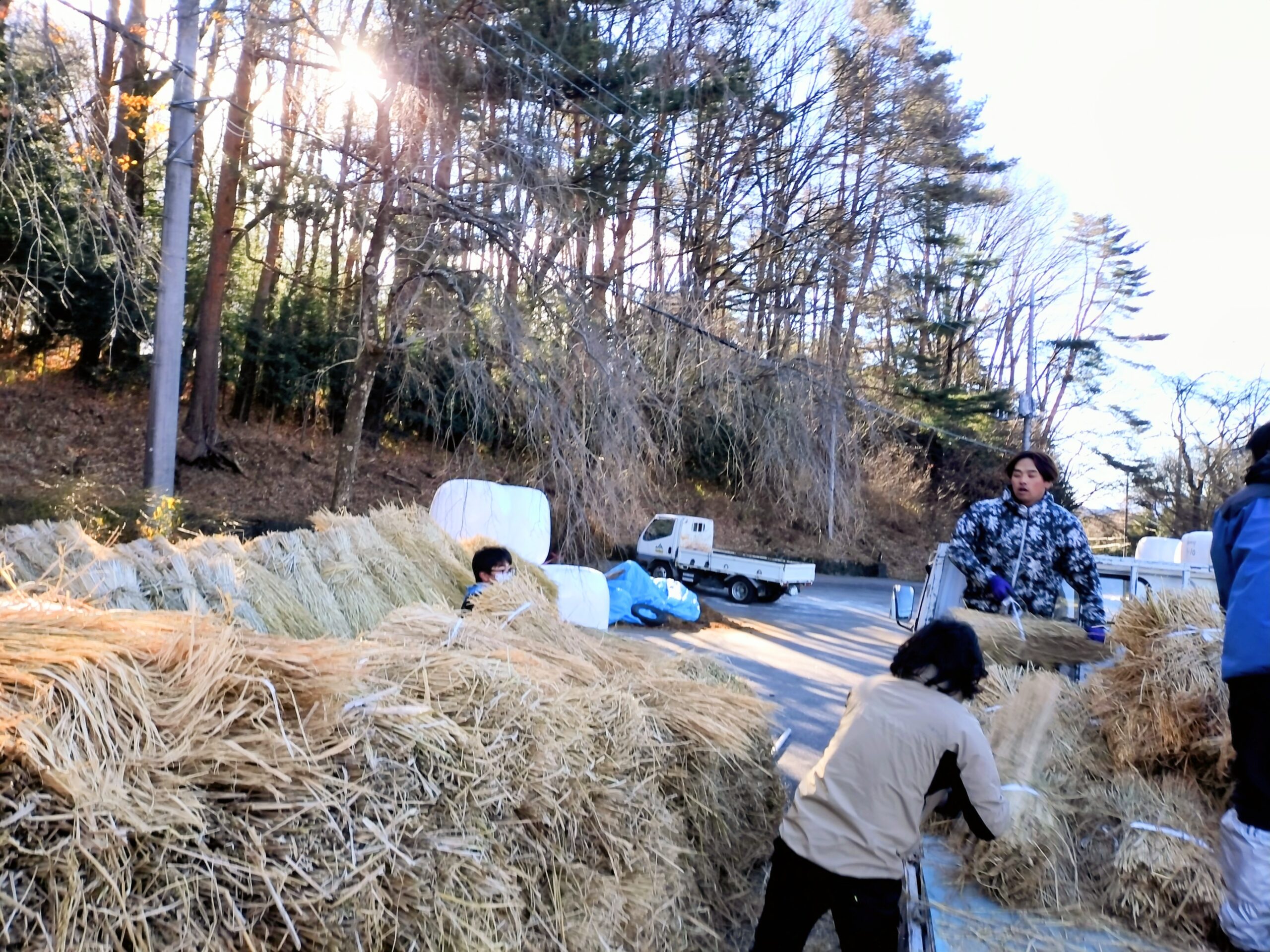 12月上旬に畜産農家さんに稲藁の配達をしました。 この日は、2tトラック2台と軽トラ4台に、4反7畝分の稲藁を積み込みました。 畜産農家さんの牧場横に積み下ろしています。 テンポ良く積み下ろされていきます。 牛さん達、食べてね。 -
